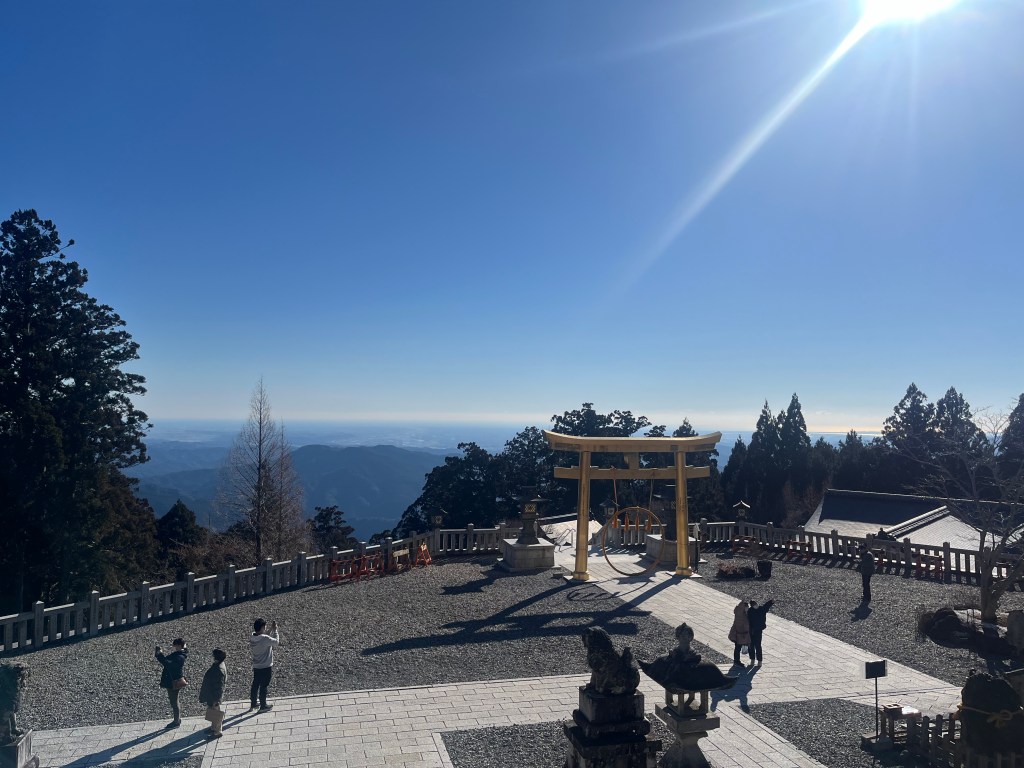 The summit of Mt. Akiba is 866m. When I arrived there, a dazzling golden torii gate was waiting for me. The view from the shrine grounds was beautiful, and the air was clear, giving me a refreshing feeling that cleansed my heart. I was moved by the blue sky, the golden torii gate, and the view of the mountains and cityscape below.